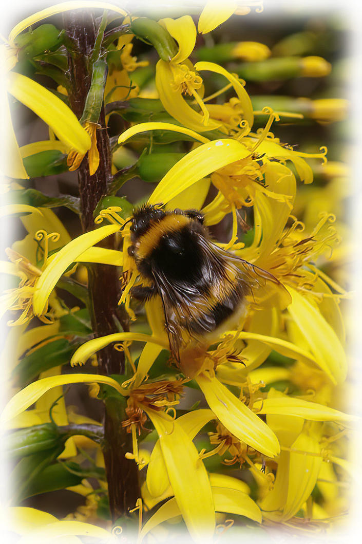 A bee feeding on Ligularia ‘Little Rocket’ in the back garden.