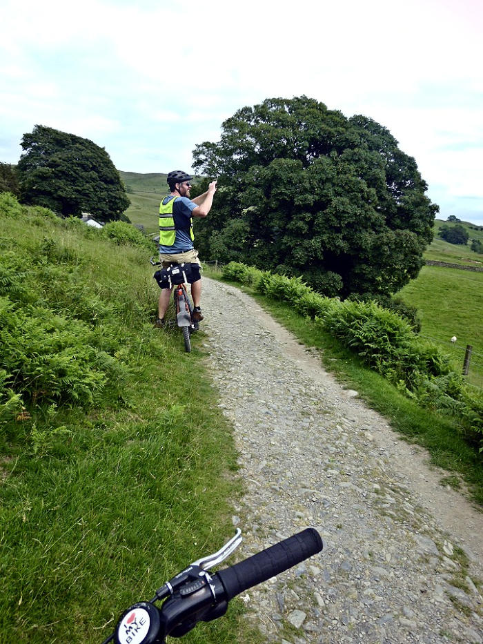 enjoying the warm weather. We stop for lunch at side of cycle path with good view looking up Elter Water.
