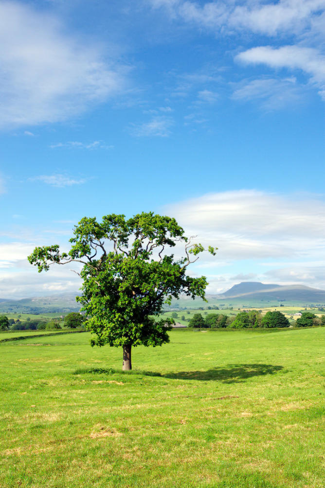 A tree in field at side of West Lane Hill with Ingleborough in the background.