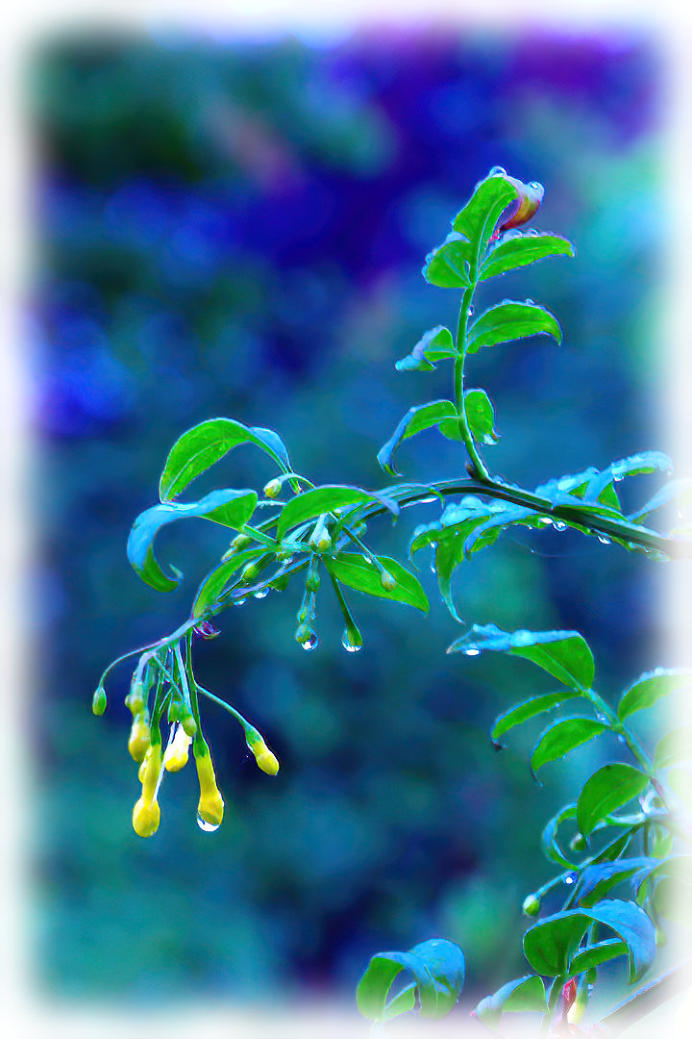 Rain drops on Jasminum humile in the back garden.