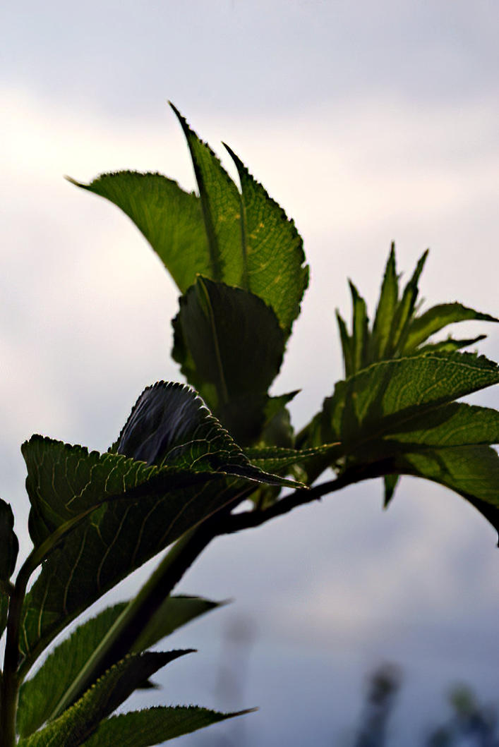 Common Elder leaves growing above the hedge at side of Hilderstone Lane