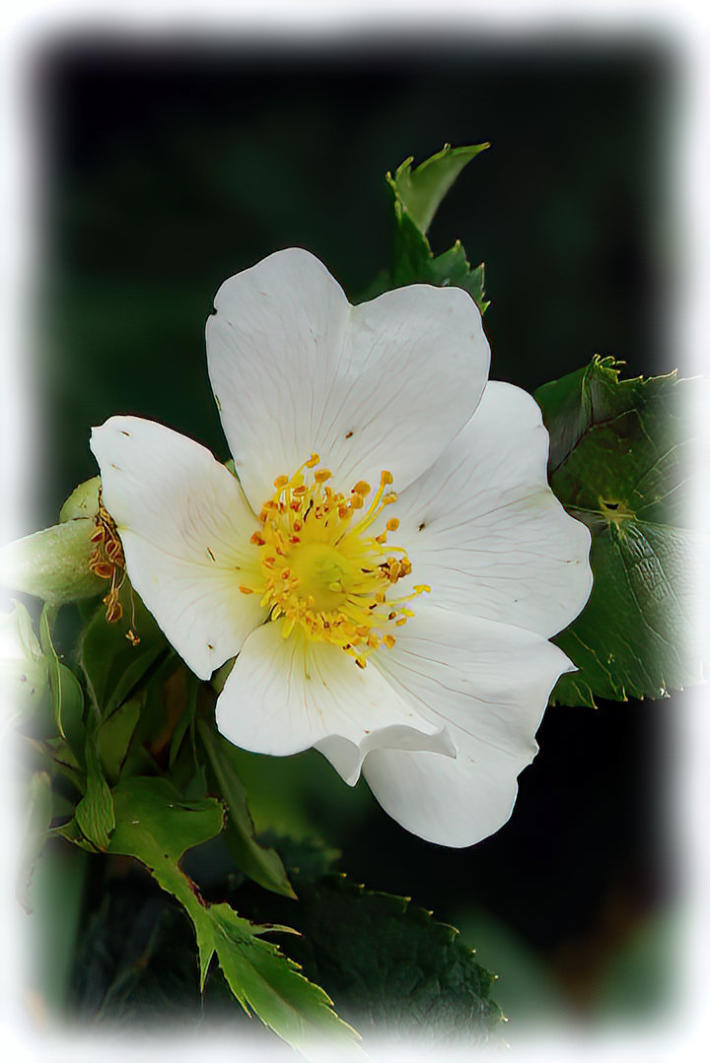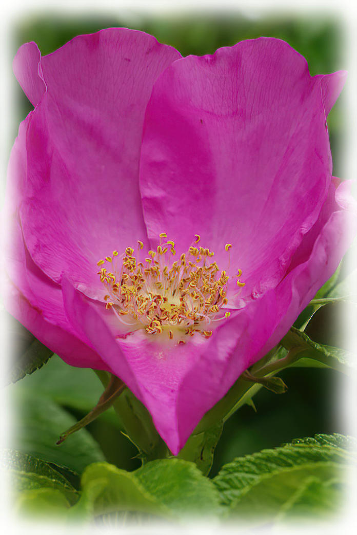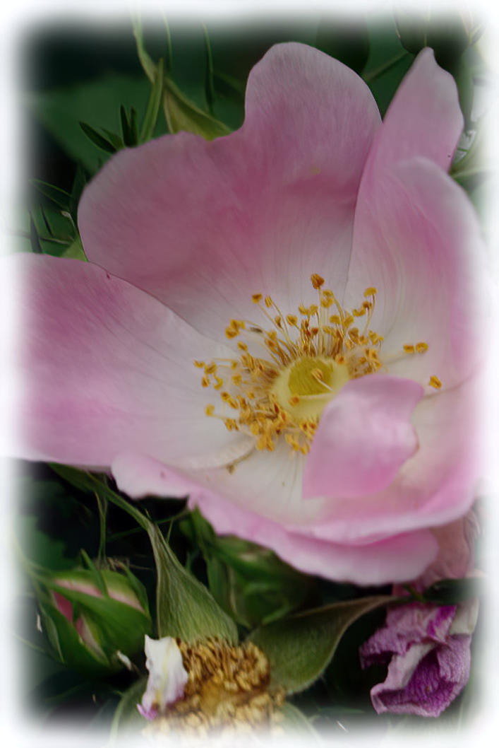 Rosa rugosa flowering at the side of Cinderbarrow Lane.