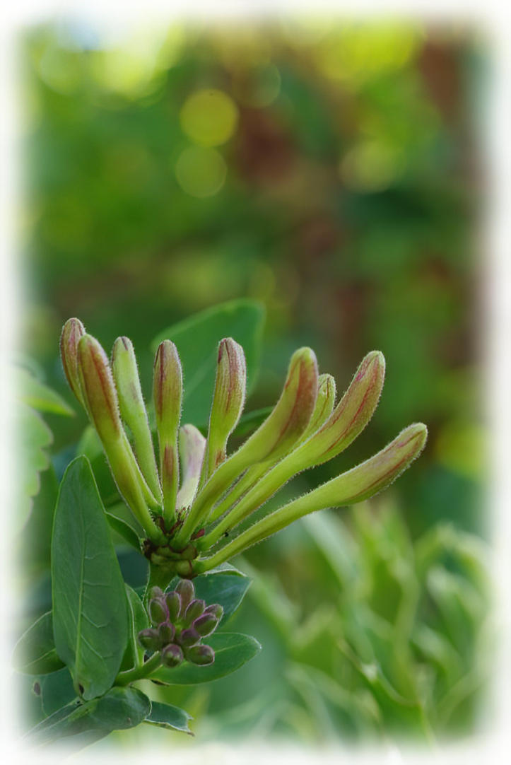 The flower buds of Lonicera periclymenum ‘Graham Thomas’ in the back garden.