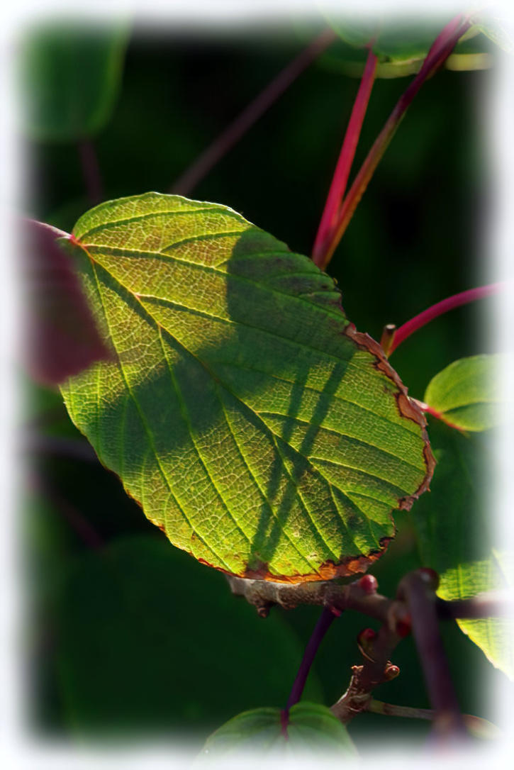 Sunlight shining on the leaf of Corylopsis willimottiae in the back garden.