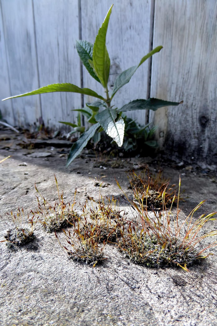 Moss and buddleja growing on farm buliding in Rigmaden.