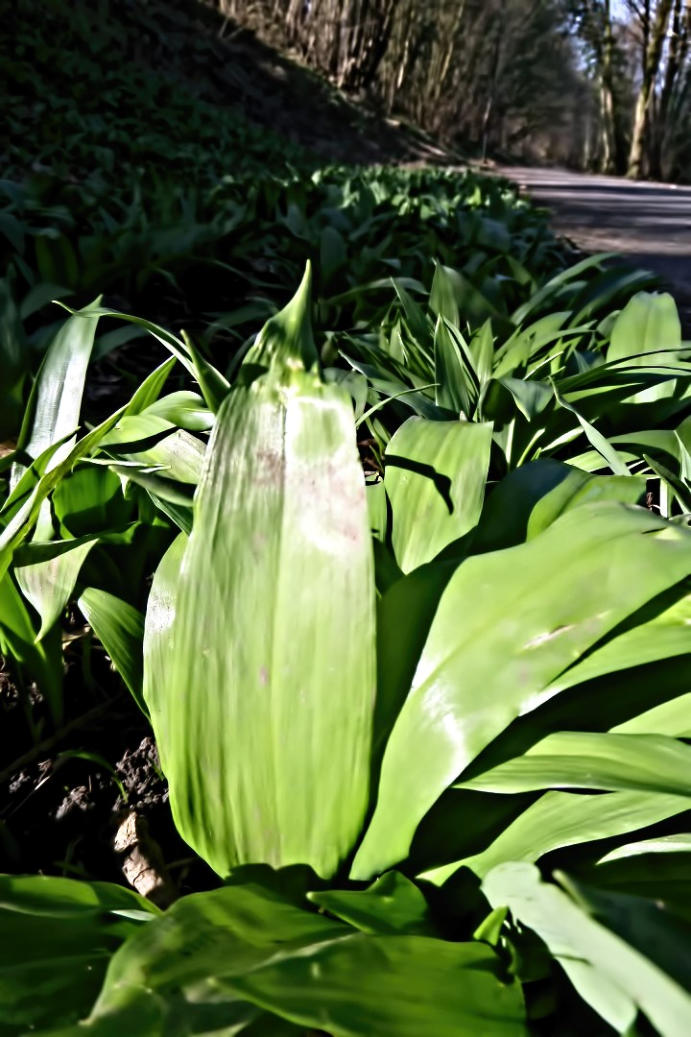 The morning sunlight on Wild Garlie leaves at side of the cycle path.