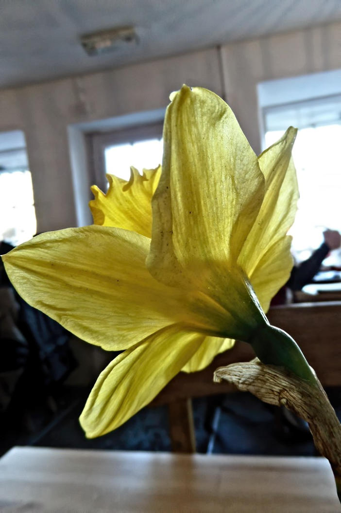 A daffodil in The crossing point cafe in Kirkby Lonsdale.