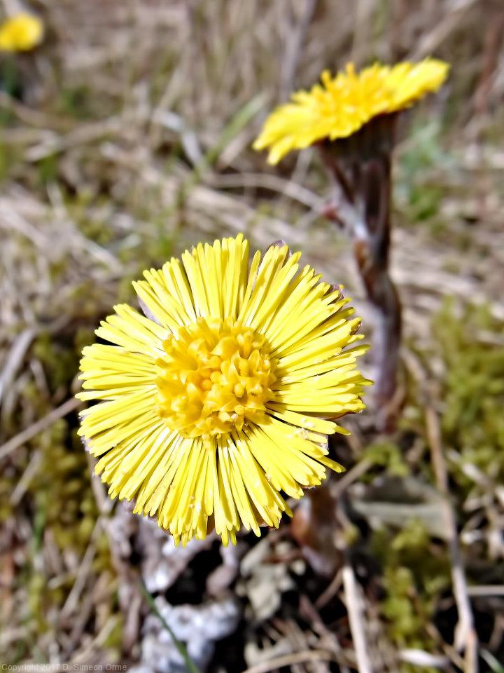 Coltsfoot at side of the lane.