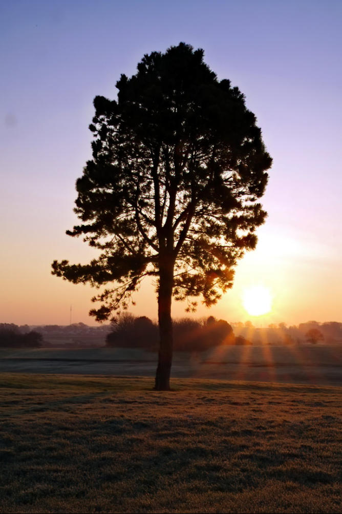 The pine next to 17th fairway on Morecambe Golf Course with the sun raising in the background.