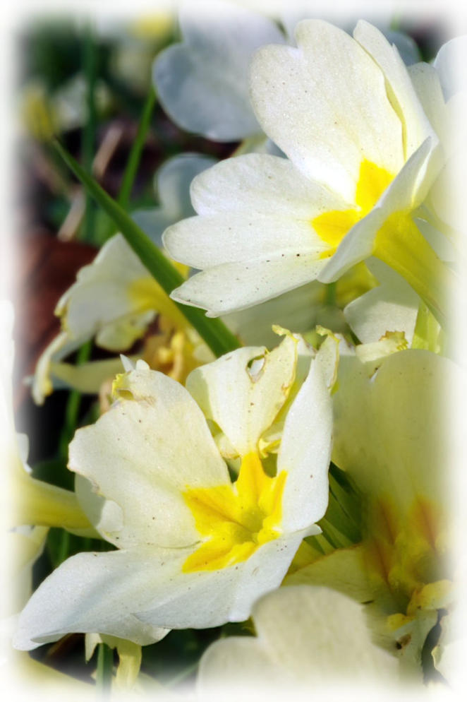 Primroses in flower on the village green in Borwick.