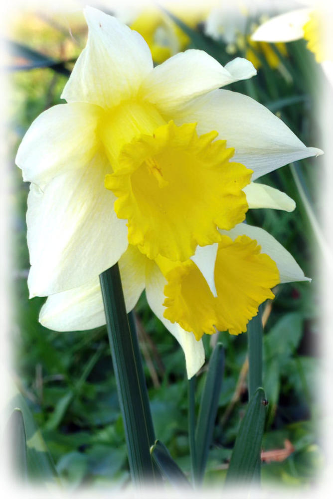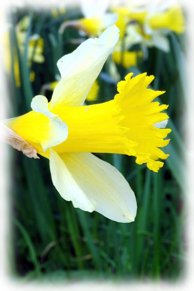 Daffodils in flower on the village green in Borwick