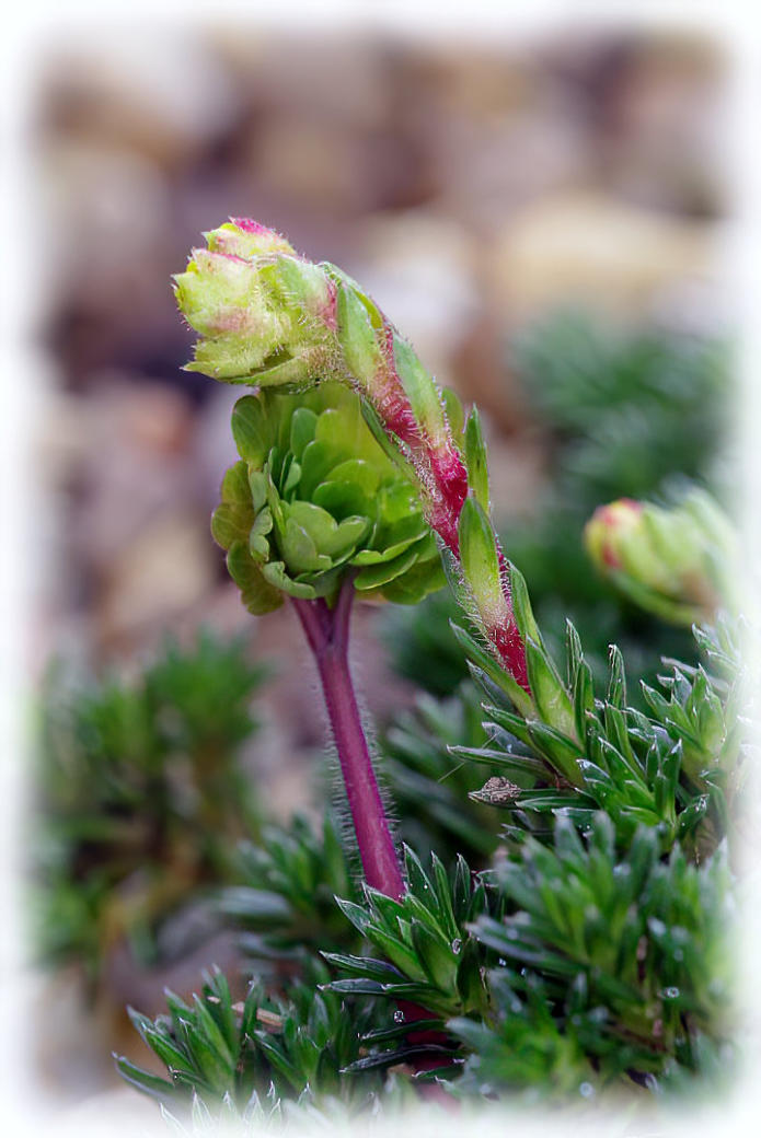 Saxifraga eudoxiana ‘haagii’ flowering in container in the garden.
