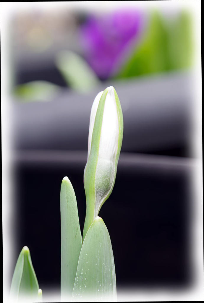 Galanthus elwesii ‘Polar Bear’ coming into flower in container in the garden.