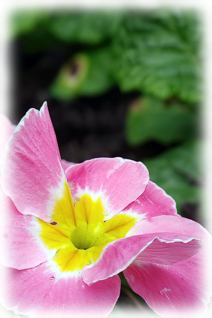 Primula vulgaris ‘Candy’ flowering in container in the garden.