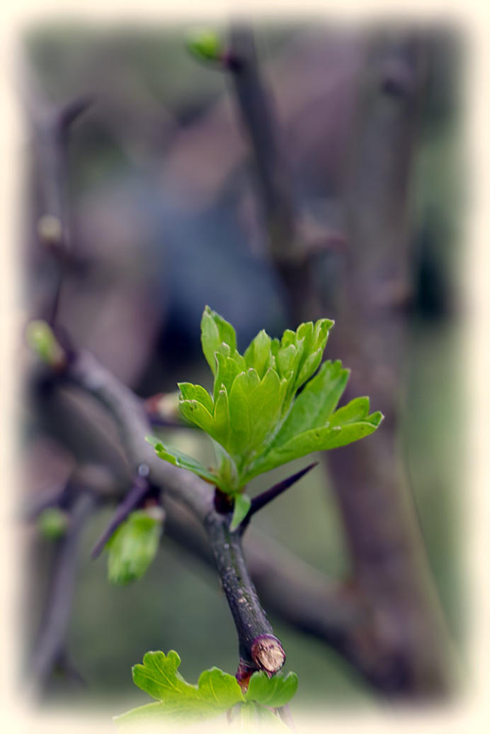 Hawthorn shoots in the hedge at side of the Old Lane near Holme.