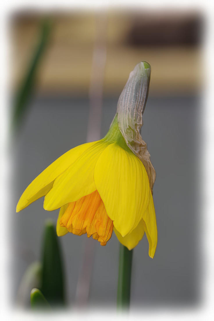 Narcissus ‘Jetfire’ flowering in container in front garden.