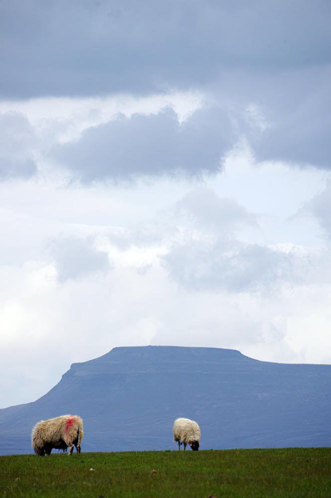 Two sheep in field with Ingleborough in the background.