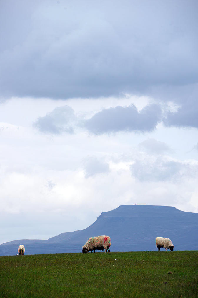 Three sheep in field with Ingleborough in the background (Photo taken from School Lane)
