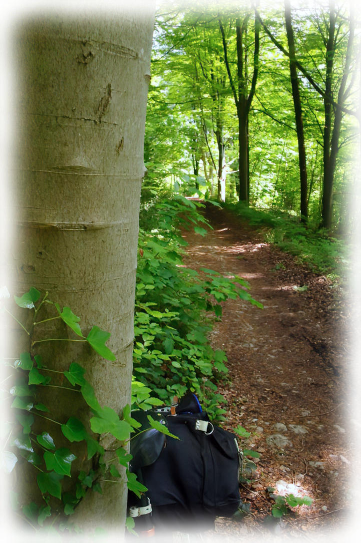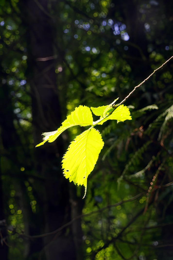 Sunlight shining on leaves at side of the bridleway.