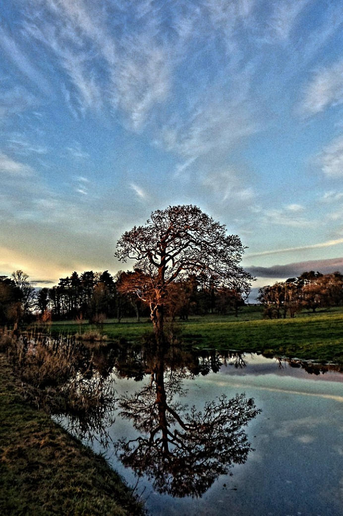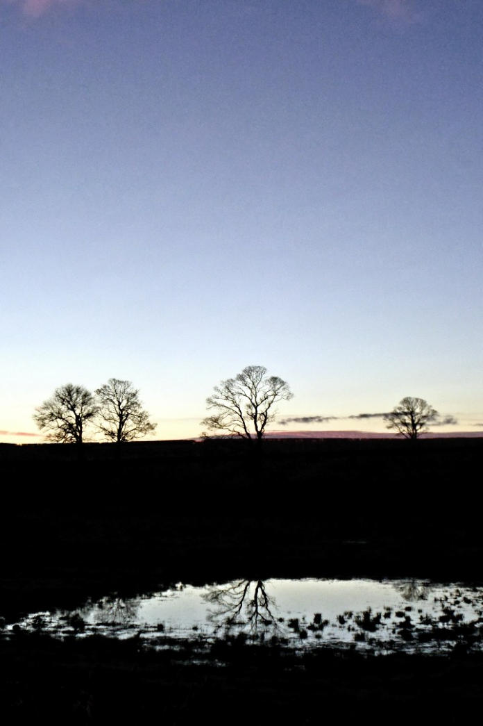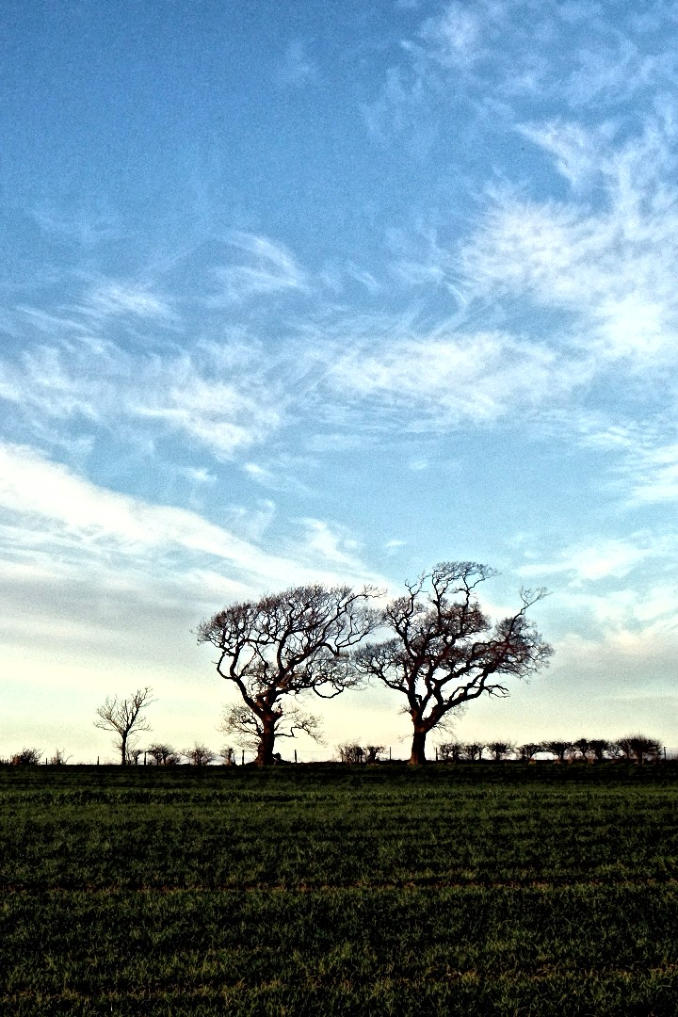 Late afternoon sun light on two trees in a field near Winmarleigh