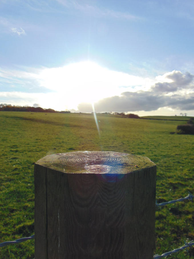 Afternoon sunlight shining on fence post on Back Lane.