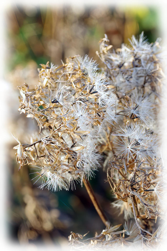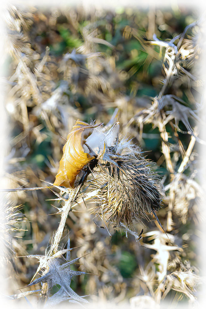 A leaf on Thistle seed head at side footpath around Hawes Water.