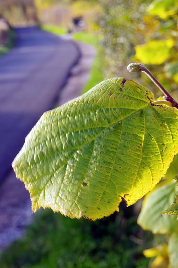A close up view of Hazel leaf and the view looking back along the lane.