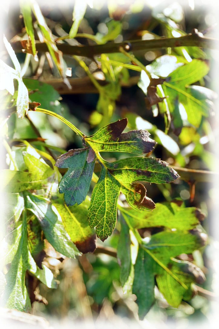 Late afternoon sunlight shining down on Hawthorn leaves at side of Hilderstone Lane.