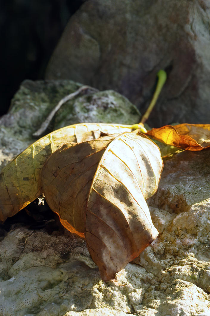 Sunlight shining down on leaf on wall.