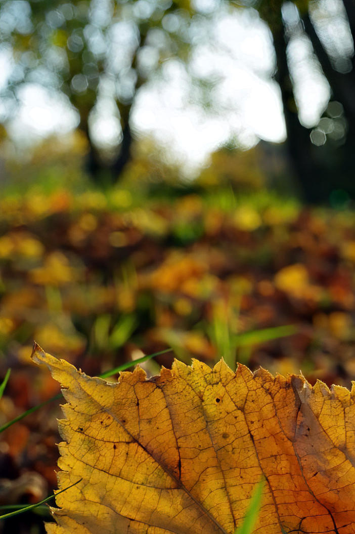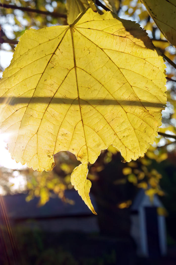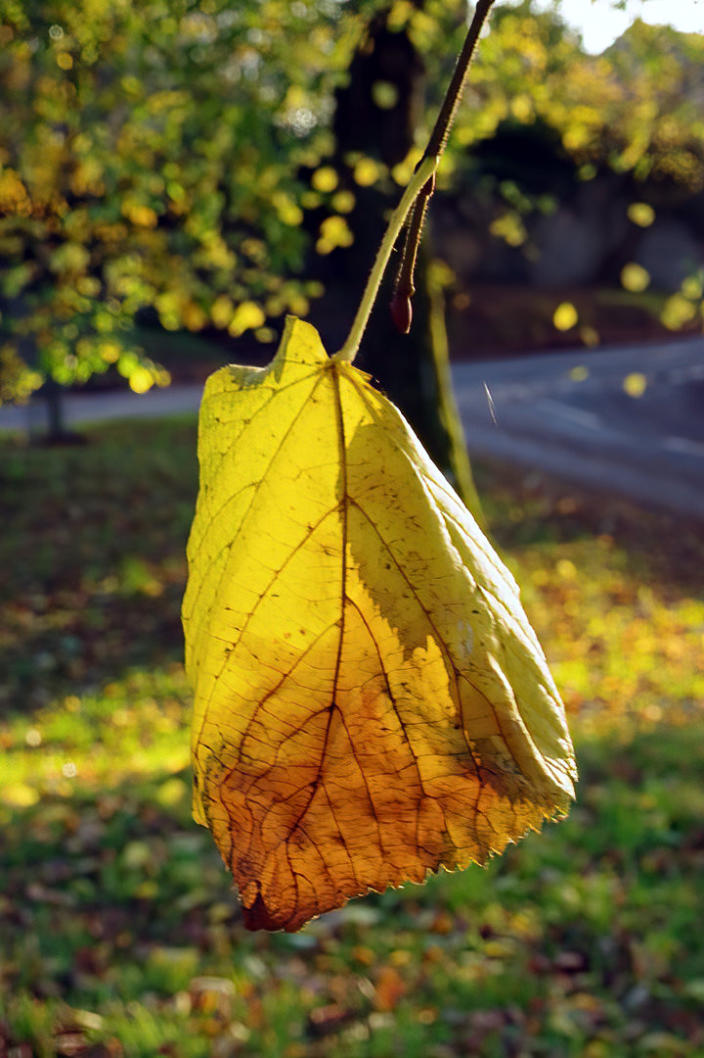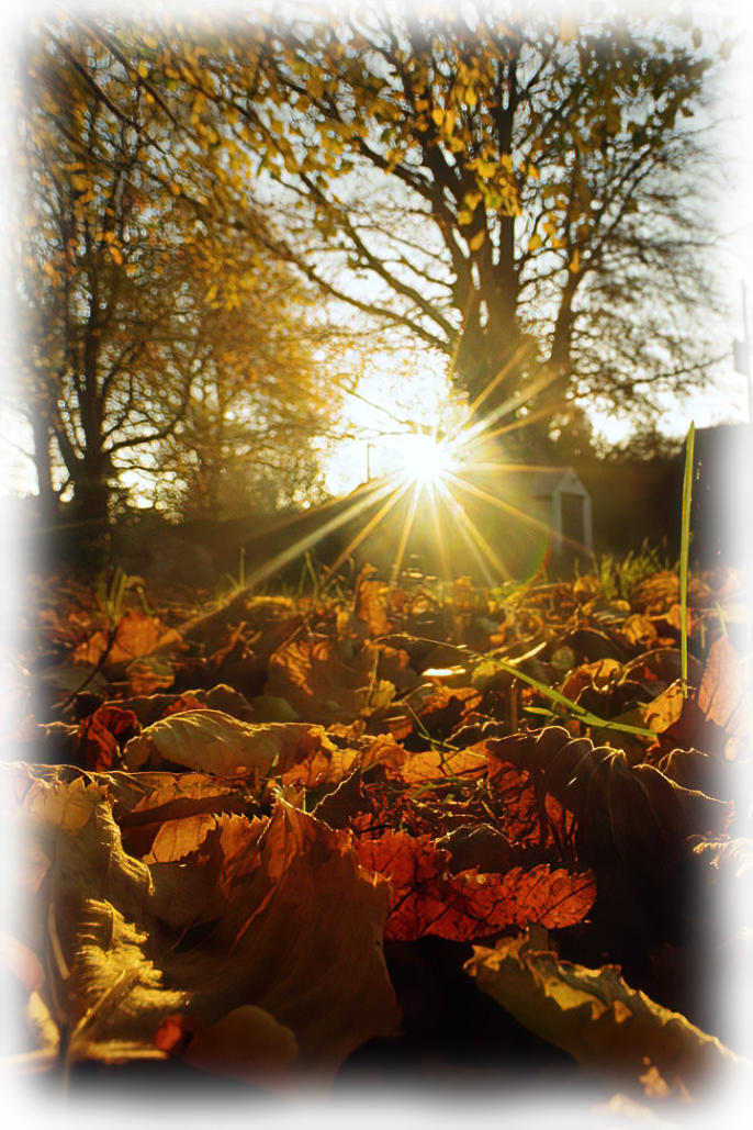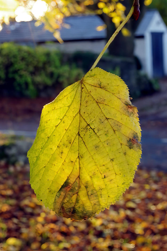 Above photos of sunlight shining on leaves on the village green in Borwick.