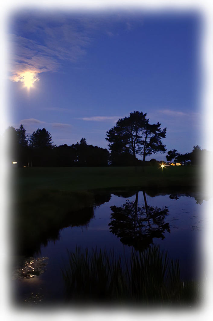 Moonlight shining on the pond by 8th fairway on Morecambe Golf Course.