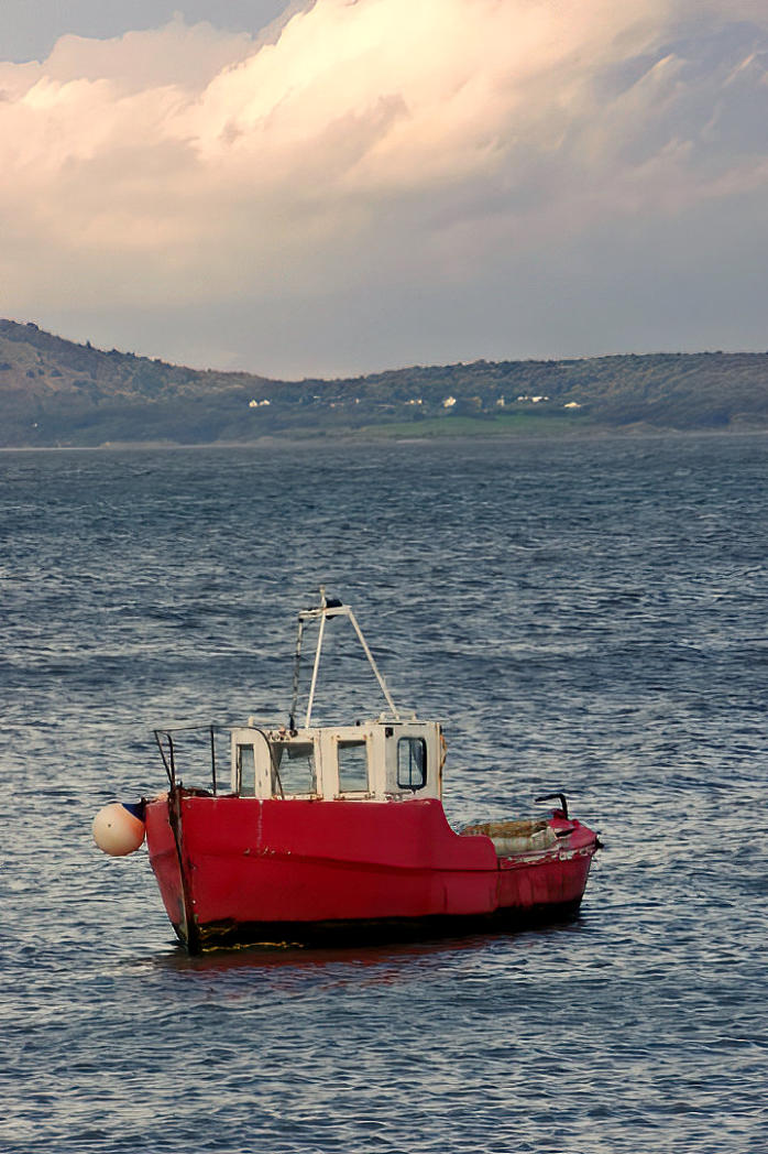 A small fishing boat anchored near the promenade.