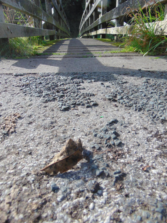 The view looking across the foot / cycle bridge over River Keer near Hagg Wood