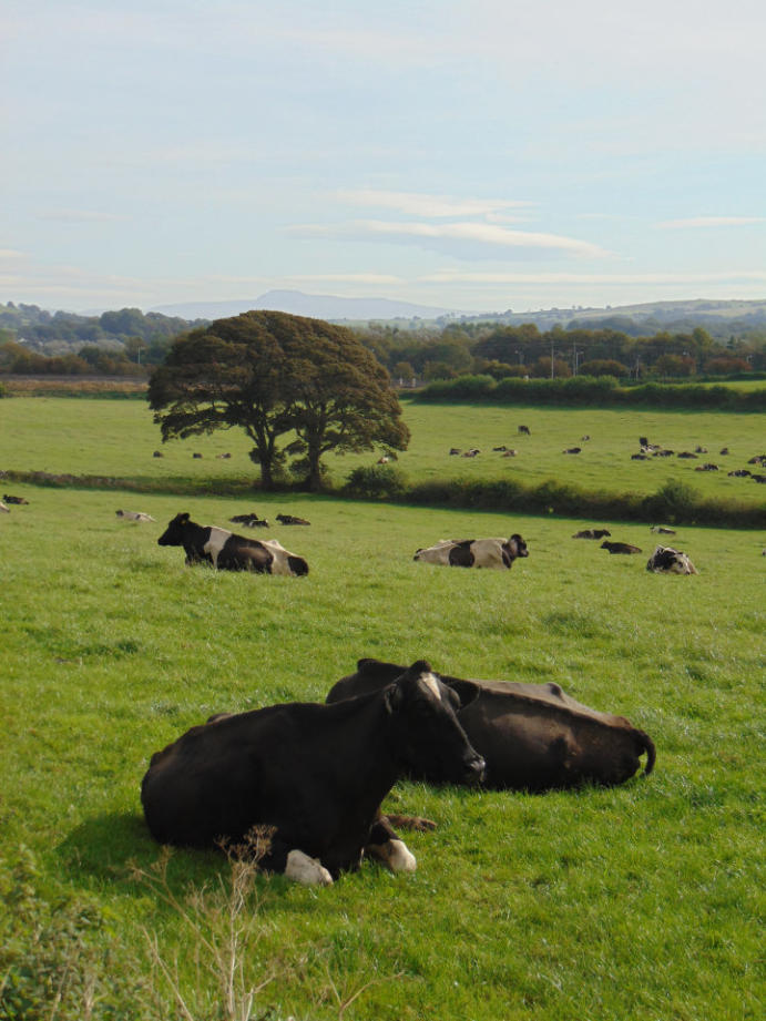 The view looking across the fields towards the A6 and with Ingleborough in the distance background