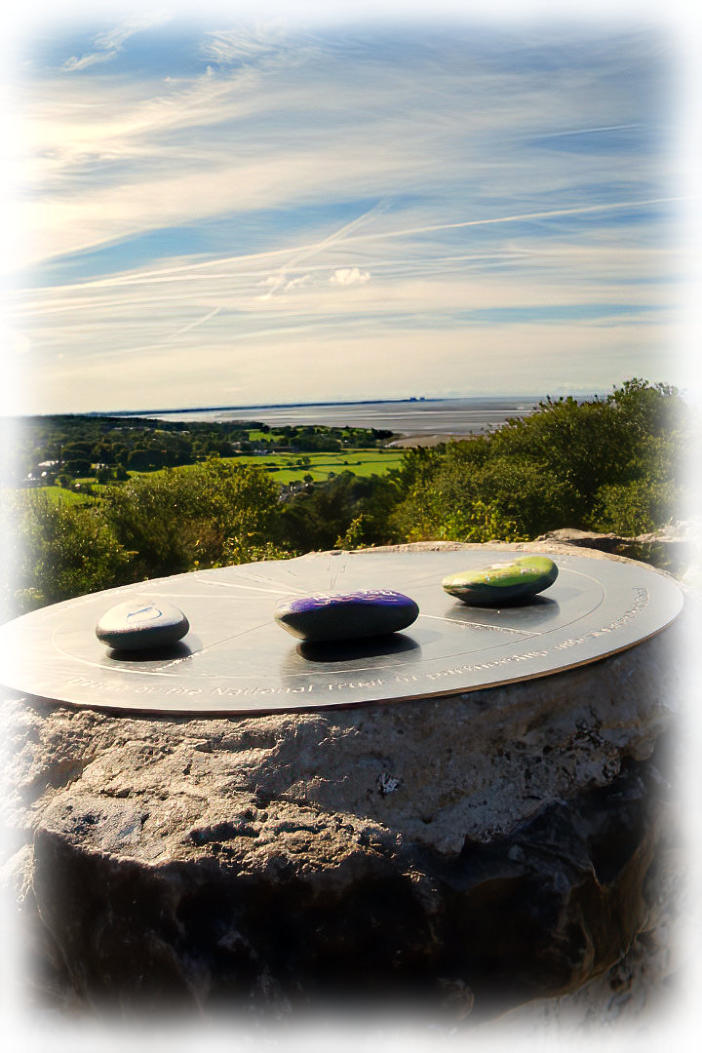 Three painted stones in memory of Queen Elizabeth II on viewing point near the Pepper Pot near Silverdale. You