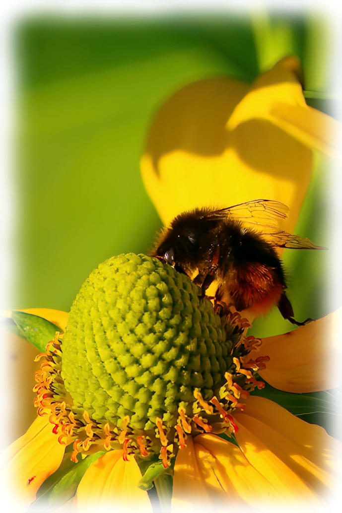 A bee feeding on Rudbeckia laciniata ‘Luligold’ in the back garden.