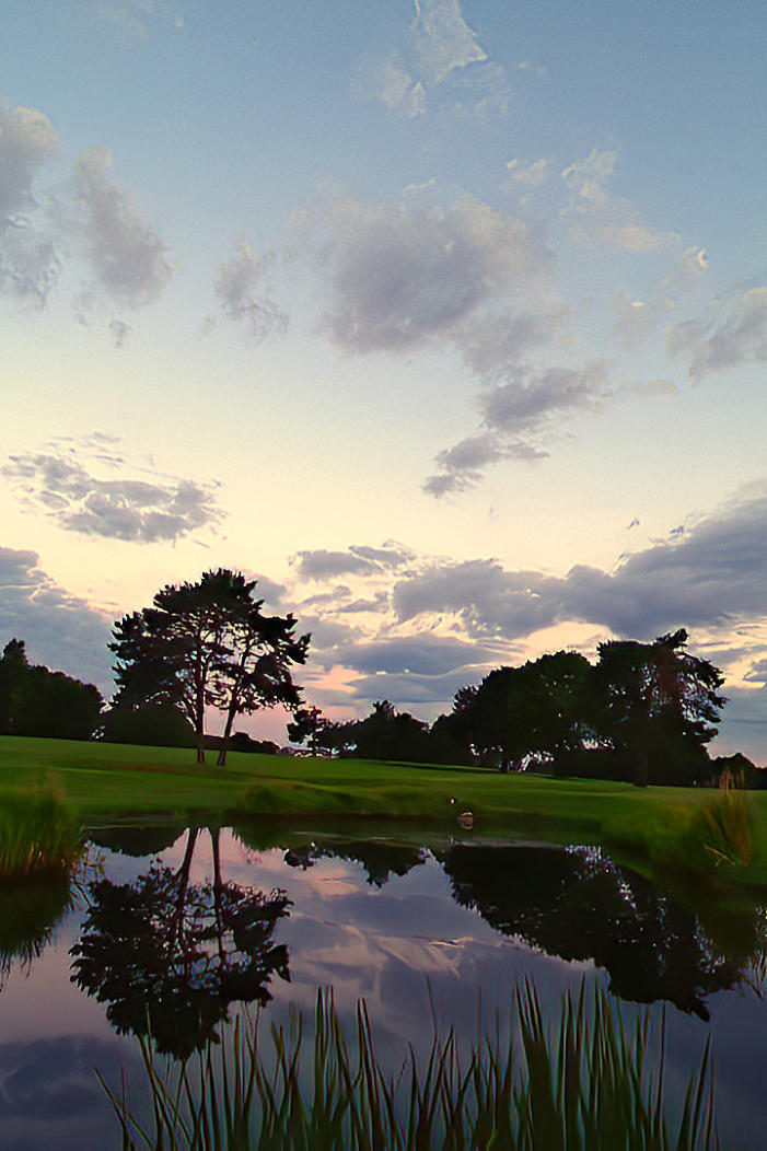 An early morning view looking across the pond by the 8th fairway towards 9th fairway and the clubhouse on