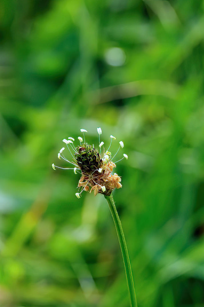 Ribwort Plantain flowering at side of the footpath from Dolly Wood to near Leighton Beck Bridge.