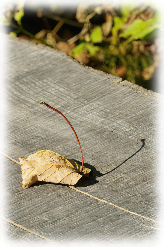 A leaf on bench at side of the footpath.