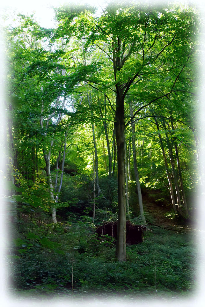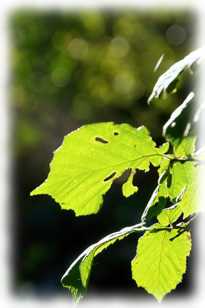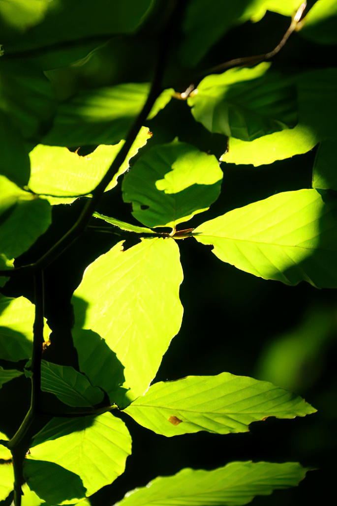 Sunlight shining through leaves of Middlebarrow Wood.